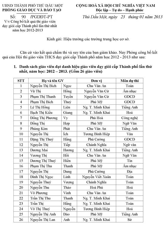 Công bố kết quả thi GV dạy giỏi cấp Thành phố năm học 2012 - 2013