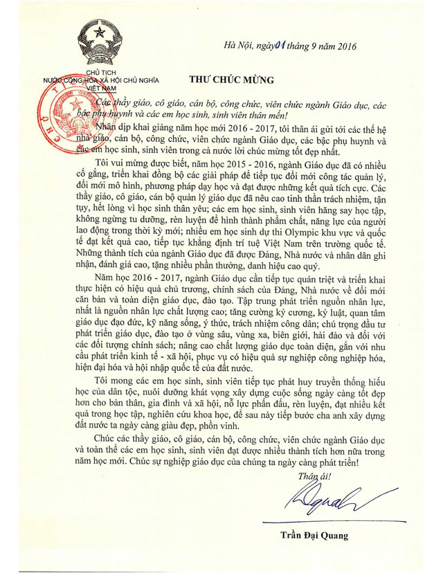 Nhân dịp khai giảng năm học mới 2016-2017, Chủ tịch nước Trần Đại Quang đã gửi thư tới các thế hệ nhà giáo, cán bộ, công chức, viên chức ngành Giáo dục, các bậc phụ huynh và các em học sinh, sinh viên trong cả nước, sau đây là toàn văn thư của Chủ tịch nước: