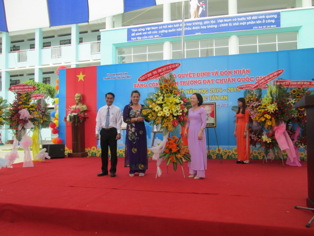 Ông Dương Văn Bốn phó trưởng phòng GD&ĐT thành phố Thủ Dầu Một thông qua quyết định số 999/QĐ-UBND ngày 22/04/2015 của UBND tỉnh Bình Dương về việc công nhận trường TH Tân An đạt chuẩn quốc gia MĐ 1 theo thông tư số 59/2012TT-BGDĐT ngày 28-12-2012 của Bộ GD&ĐT ban hành Quy định về tiêu chuẩn đánh giá, công nhận trường tiểu học đạt mức chất lượng tối thiểu, trường tiểu học đạt chuẩn quốc gia.