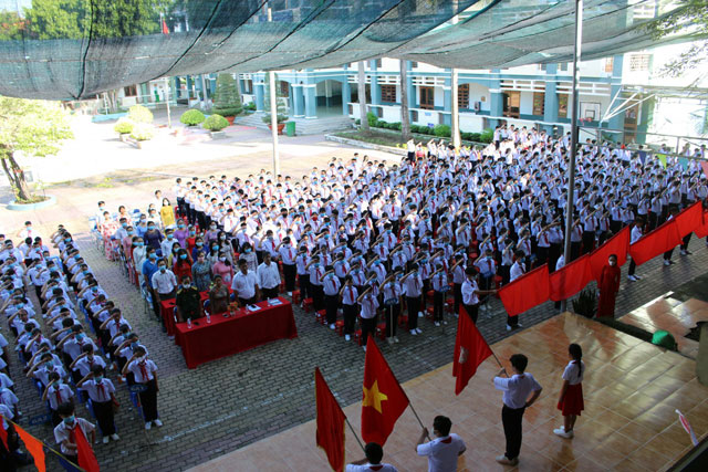 Quang cảnh chào cờ Khai giảng năm học mới 2020-2021 - Ảnh: THCS Phú Cường